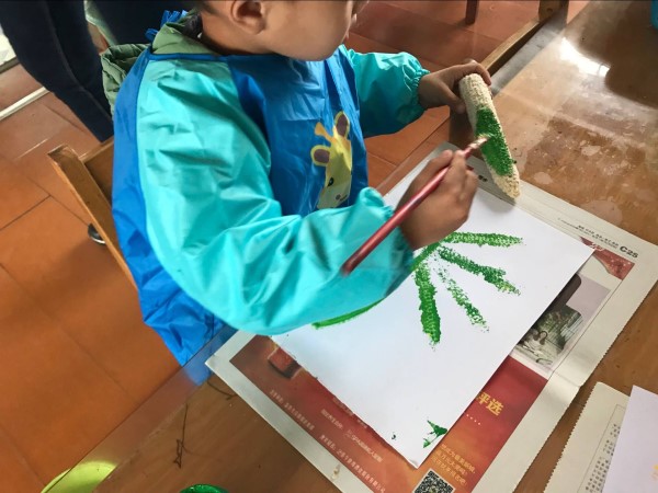 分析 评价 | 玉米在农家比较常见,许多孩子对它不陌生。在美工区看到玉米棒孩子们是有些惊喜的,所以纷纷选择了玉米棒进行美术活动。但是拿到玉米棒之后,却没有想好用它画什么,怎么画。而是经过思考,把玩一会,才慢慢的想出用拓印的方法来作画。在做拓印之前,Z并未想好要画个什么,最后的作品呈现,我问他时,他根据成品说出了小草,游戏的目的性不是特别明确。 | |||||