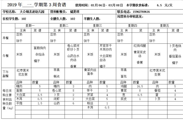2019年上第三周食谱(2019年3月4-3月8日)