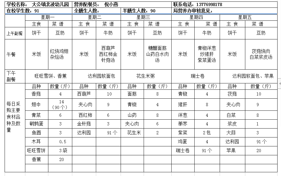 北凌幼儿园2020-2021学年度第一学期第13周食谱
