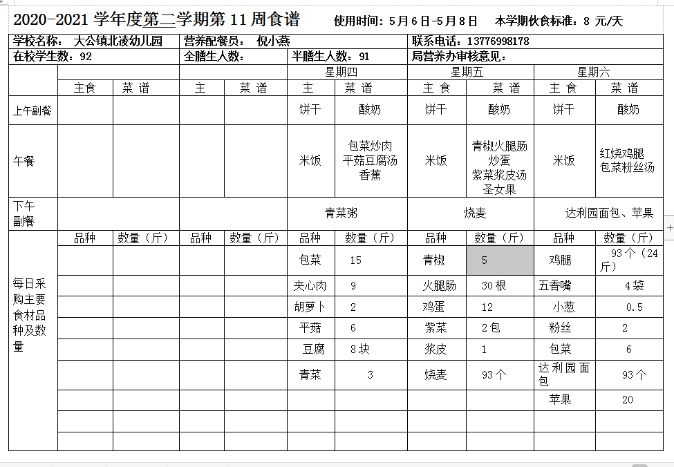 北凌幼儿园2020-2021学年度第二学期第11周食谱
