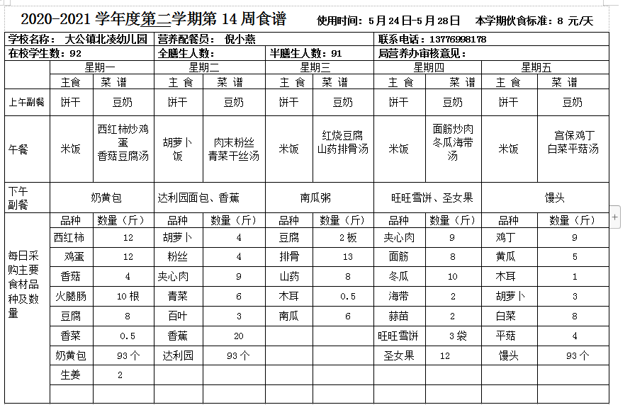 北凌幼儿园2020-2021学年度第二学期第14周食谱