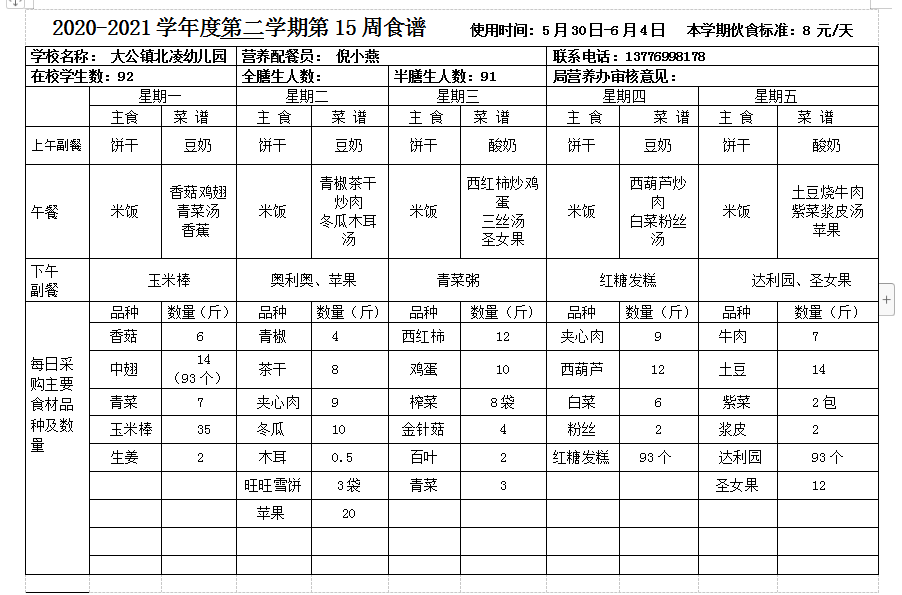 北凌幼儿园2020-2021学年度第二学期第15周食谱