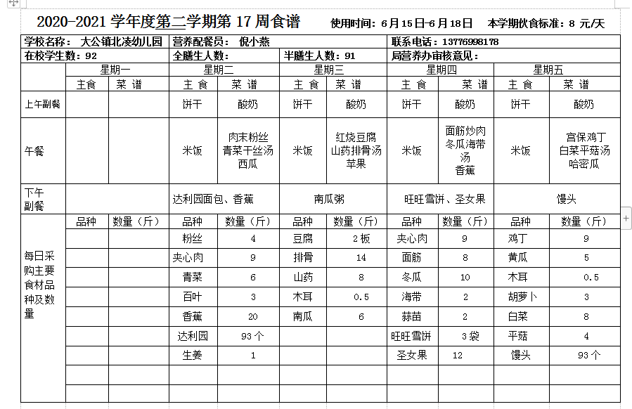 北凌幼儿园2020-2021学年度第二学期第17周食谱