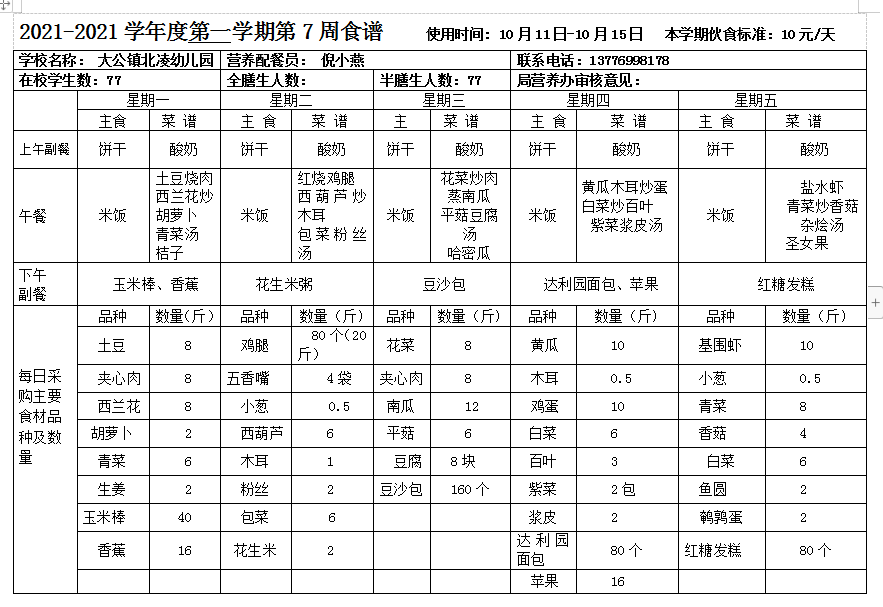北凌幼儿园2021-2022学年度第一学期第7周食谱