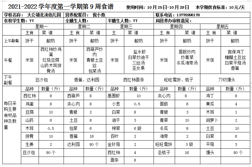 北凌幼儿园2021-2022学年度第一学期第9周食谱