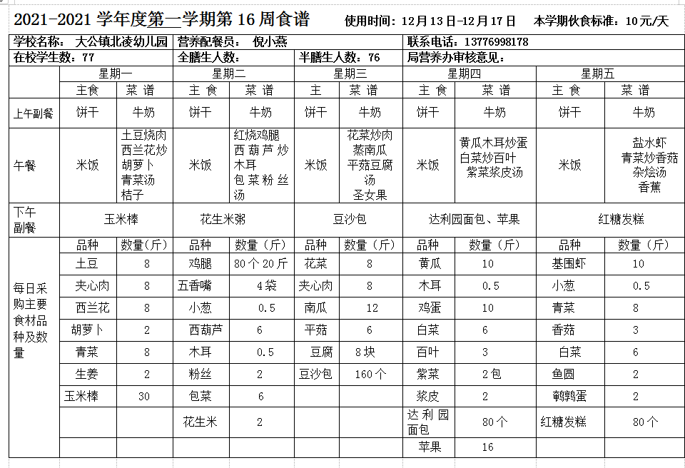 北凌幼儿园2021-2022学年度第一学期第16周食谱