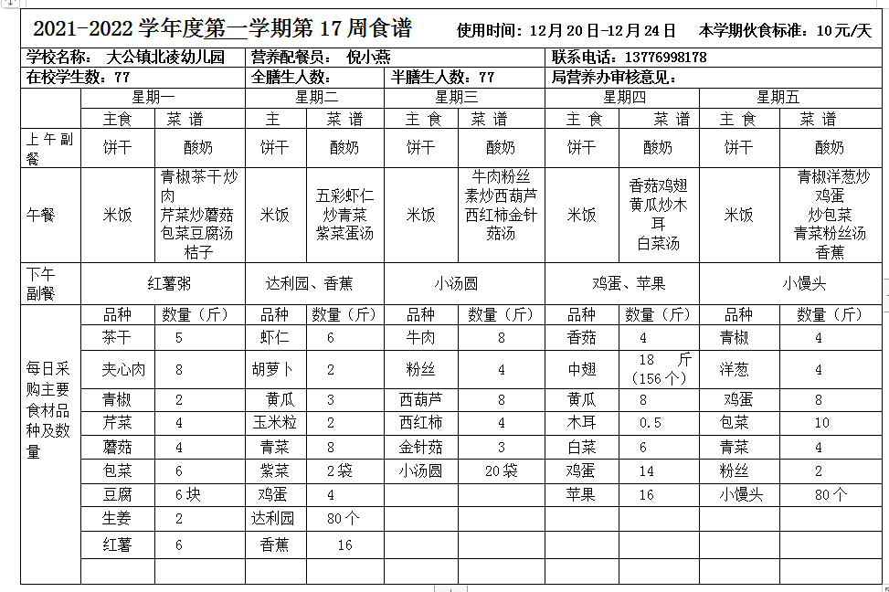 北凌幼儿园2021-2022学年度第一学期第17周食谱