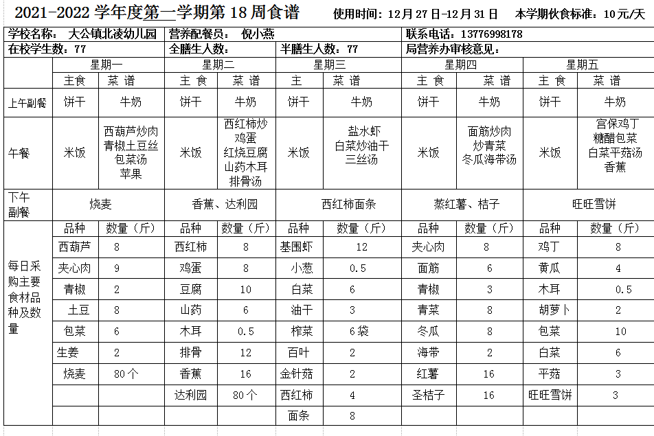 北凌幼儿园2021-2022学年度第一学期第18周食谱