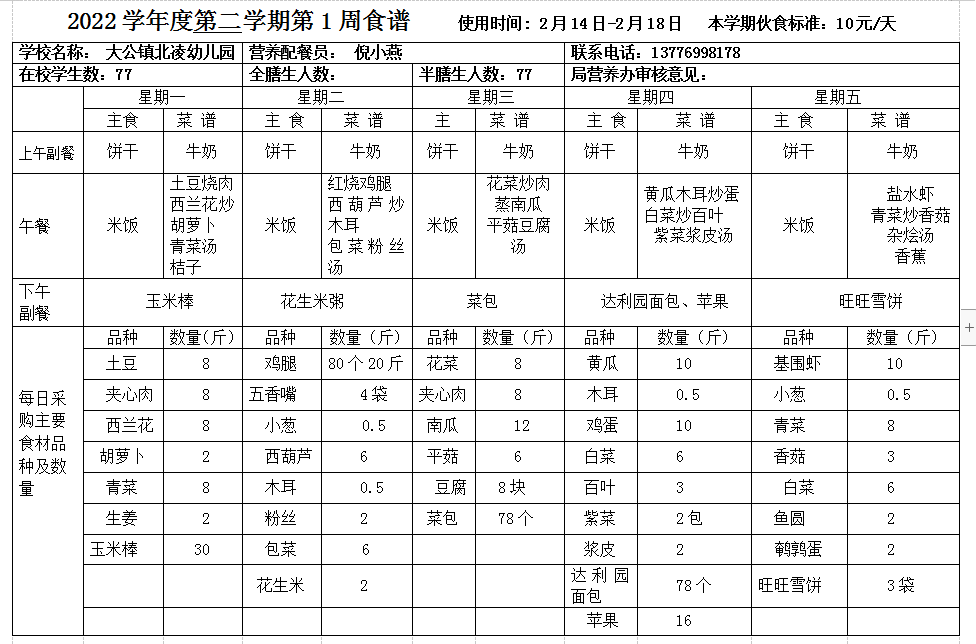 北凌幼儿园2021-2021学年度第二学期第1周食谱