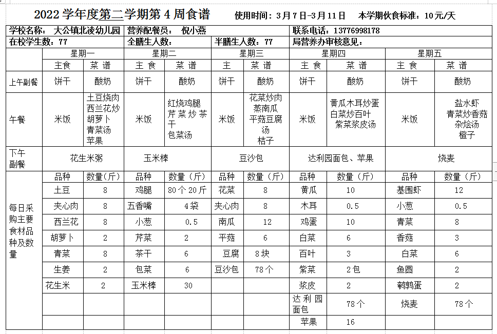 北凌幼儿园2021-2022学年度第二学期第4周食谱