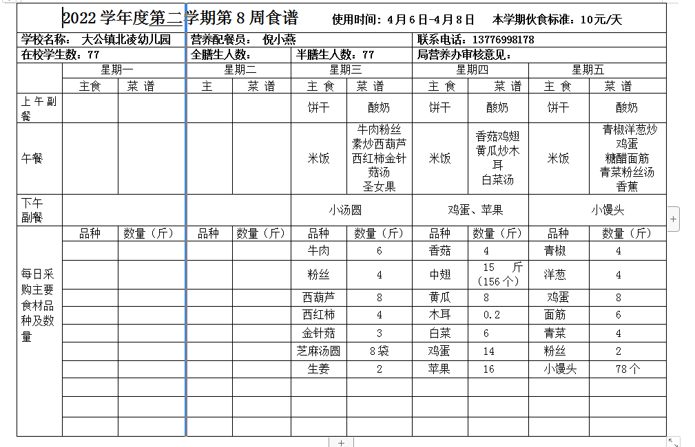 北凌幼儿园2021-2022学年度第二学期第8周食谱