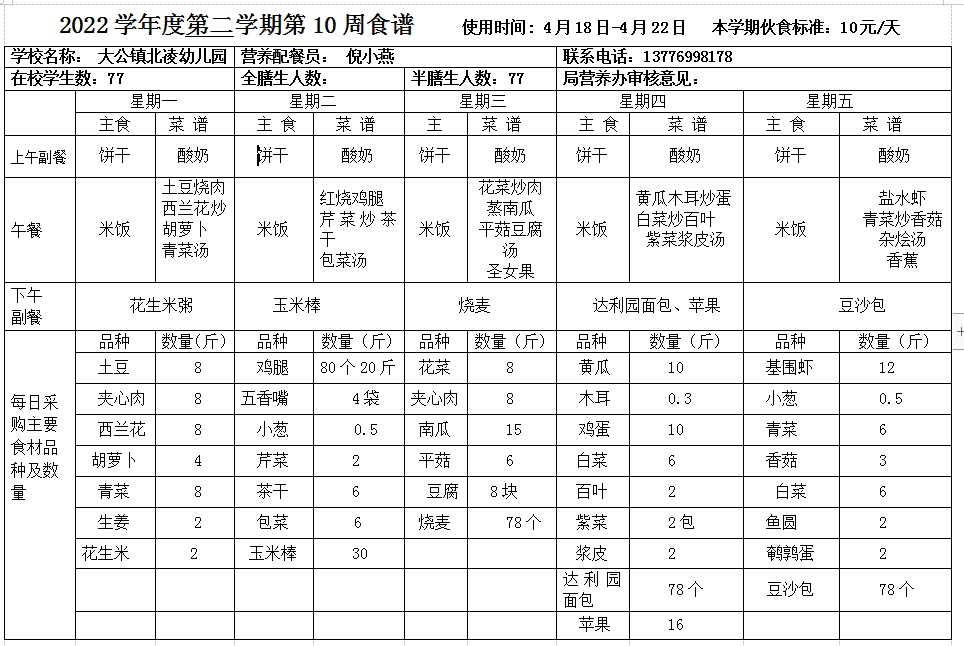 北凌幼儿园2021-2022学年度第二学期第10周食谱
