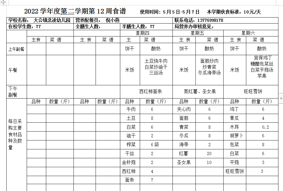 北凌幼儿园2021-2022学年度第二学期第12周食谱