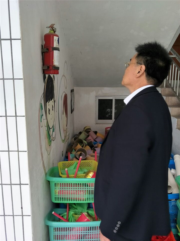镇教管办安全工作领导小组查看了幼儿园环境,对幼儿园门卫室监控周界报警、楼房墙面、屋顶、楼梯扶手、电器线路、消防等进行了全面细致的大检查,对存在的安全隐患逐一消除,确保安全无死角。仔细查看每层楼消防栓里的水枪、水带是否能完好,灭火器压力是否正常,确保消防器械能正常使用。
