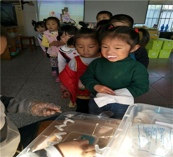 上午10:00,保健医生耐心细致地为幼儿讲解了保护牙齿的重要性,接着便开始了进行牙齿涂氟活动。保健医生依次检查幼儿的口腔卫生情况,并及时与班级老师交流幼儿的情况。孩子们排着队,安静的配合着医生的工作。涂氟时,医生告诉孩子们:涂氟半小时内不吃东西不喝水,每天养成早晚刷牙,餐后漱口的好习惯。