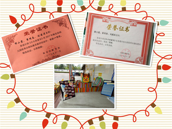 我园一贯注重教师设计、制作和运用玩具的积极性和能力培养,缪小霞、崔明春、刘溪涓三位老师制作的运动类教玩具“小小农家乐”,在9月份全县幼儿园优秀自制教玩具初展赛中获得一等奖。10月份参加南通市比赛,喜获南通市幼儿园优秀自制玩教具二等奖。该作品构思巧妙、设计新颖,取材独特,趣味实用,是一套环保型、经济型的户外活动玩具。