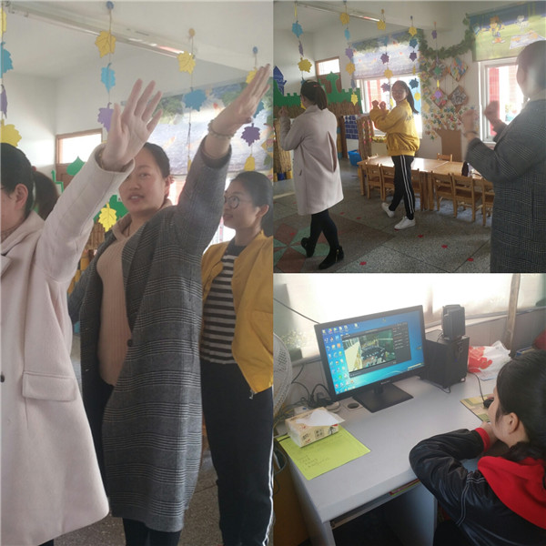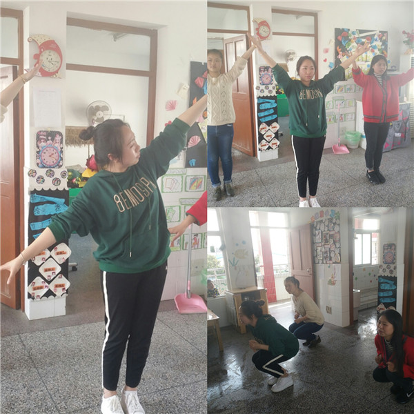 首先,全体教师精心选取了活泼、动听的音乐,各年级组利用下午幼儿离园后的时间,集体商议、探讨、编排。通过全体教师的精心编排,教师的精神面貌与团队精神在原有的基础上更强烈了,其中小班以有趣的动物模仿引起幼儿对律动的兴趣,中班教师则利用哑铃作为运动器械编排了有趣的体能操,锻炼了幼儿跑、跳、钻的技能,最后大班在新操的编排上,教师运用椅子作为早操器械,编排了队形,让幼儿的走、跑、跳等技能更加敏捷。