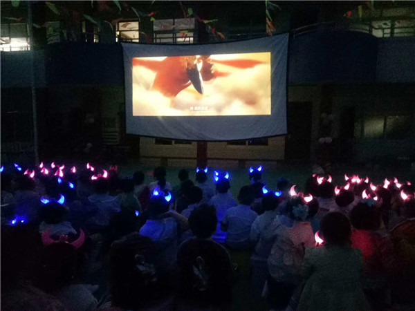 片断三:露天电影新体验用餐过后,老师们带着孩子们来到操场上拉起圆圈跳起了圈圈舞,一起感受和白天不一样的幼儿园。孩子们最感兴趣的就是观看露天电影《大圣归来》了,和同伴一起看电影、聊天,喜悦之情不言而喻。
