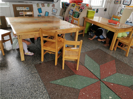 演练没有提前通知,只听"呜……",一声拉长的警报声响起。听到危险信号,小朋友们立刻停止了活动,以最快速度躲到桌子底下避险,双手抱头。