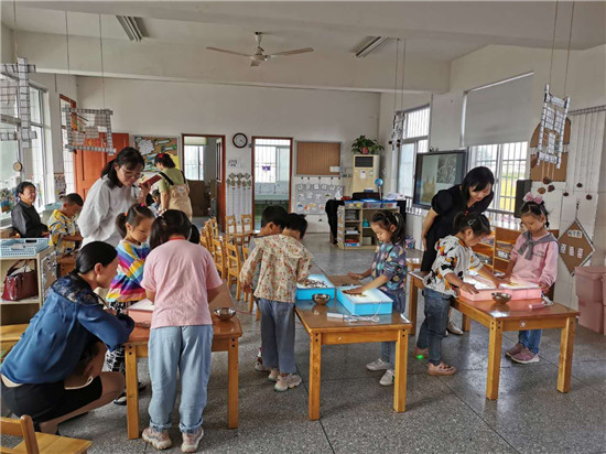 活动中,与会人员首先观摩了两节具有农家特色的集体教育活动。保教主任潘海燕执教了一节大班科学活动《有趣的沙子》,引导幼儿在游戏中感知干沙与湿沙的区别。青年教师刘溪涓执教了一节中班体育活动《好玩的蛇皮袋》,在玩一玩说一说中引导幼儿探索蛇皮袋的多种玩法促进肌肉力量的发展。