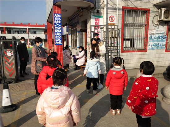 演练前,园长储呈凤组织全体教职工进行疫情防控的现场培训与学习,介绍整个应急演练流程,并对各个环节工作要点作了详细说明。演练中,教师扮演的家长和幼儿在门口间隔一米排队,将幼儿送至晨检老师处,晨检老师进行体温测量和一次晨检。如有发烧咳嗽现象,则对其进行“劝返”,并将诊治情况及时依照医疗机构诊疗方案进行治疗,一切正常,家长方可离开。另一名教师在活动室门口进行二次晨检,两次晨检均检查无异常,幼儿方可进入活动室游戏。