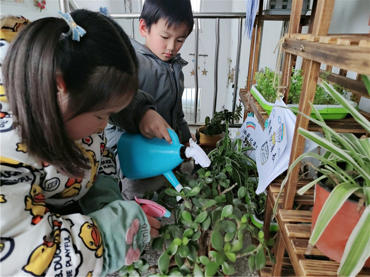 大班组孩子们在老师们的带领下,拿着喷壶为花、草、树苗浇水,洒下爱的种子……活动行将结束时,孩子们个个欢呼雀跃,关爱生态文明的喜悦之情溢于言表。