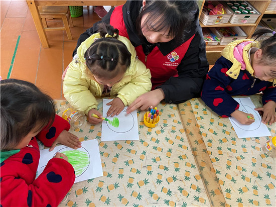 小班组幼儿在老师的指导下,通过手中稚嫩的画笔,大胆想象、泼墨挥毫,共同谱绘开展植树活动后,幼儿园及家乡所呈现的一派生机勃勃的愿景。