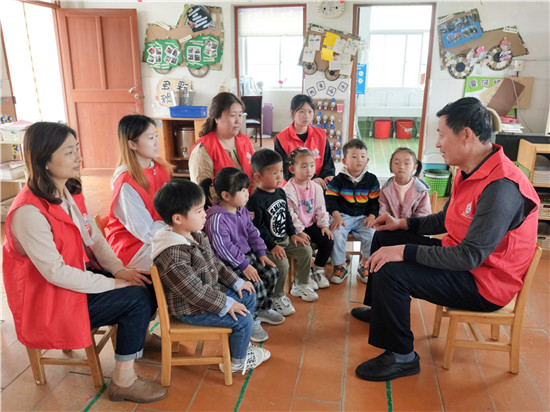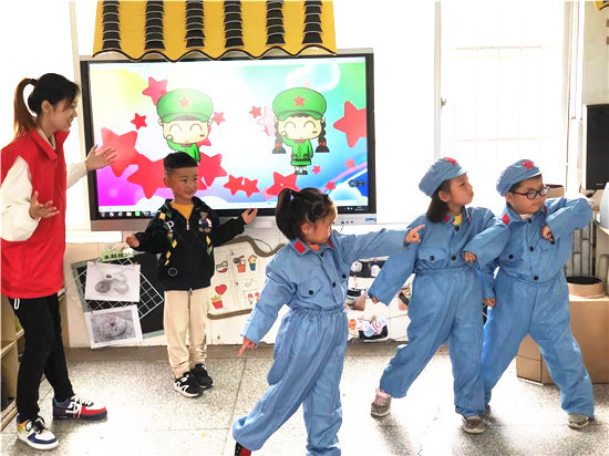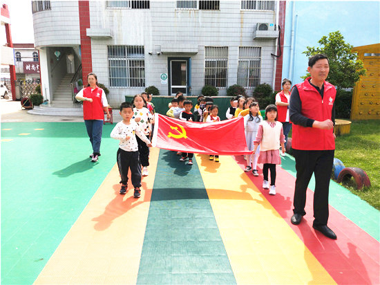 党员姜学银来到北凌幼儿园,他正在给孩子和家长们讲述自己和党的故事。他还带来了党旗,教孩子们带着党旗一起走正步。