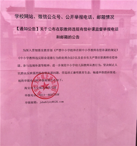 学期结束前,园长储呈凤组织全体教职工系统学习了《江苏省<中小学、幼儿园教师违反职业道德行为处理办法>实施细则》《海安市教育体育系统中小学在职教师违规补课处理办法》等规定和文件,明确纪法要求,严明师德底线,教育引导全体教职工坚决抵制有偿补课、违规补课等师德失范行为。并在学校网站、校园门口等醒目位置公布了举报电话、举报邮箱,接受全社会监督,形成治理有偿补课、违规补课高压态势。